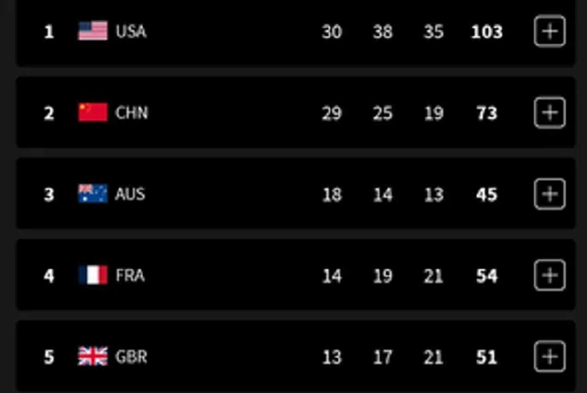 अमेरिका ने 30 स्वर्ण, 38 रजत और 35 कांस्य पदक सहित 103 पदक जीते हैं और तालिका में शीर्ष पर बना हुआ है।
