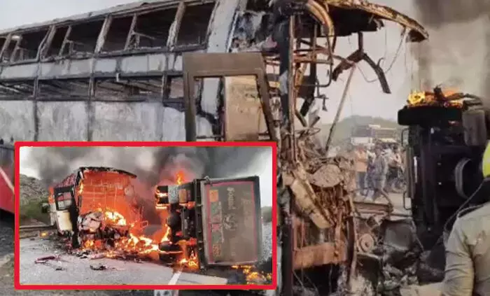 आंध्र प्रदेश के मार्कपुरम जिले में एक निजी ट्रैवल बस की टिपर ट्रक से टक्कर हो गई, जिसके बाद उसमें आग लग गई