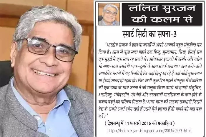 'भारतीय समाज ने हाल के बरसों में अपने आपको बहुत संकुचित कर लिया है। आज से कुछ साल पहले तक हिन्दु, मुसलमान, सिख, ईसाई सब एक मुहल्ले में एक साथ रह सकते थे।