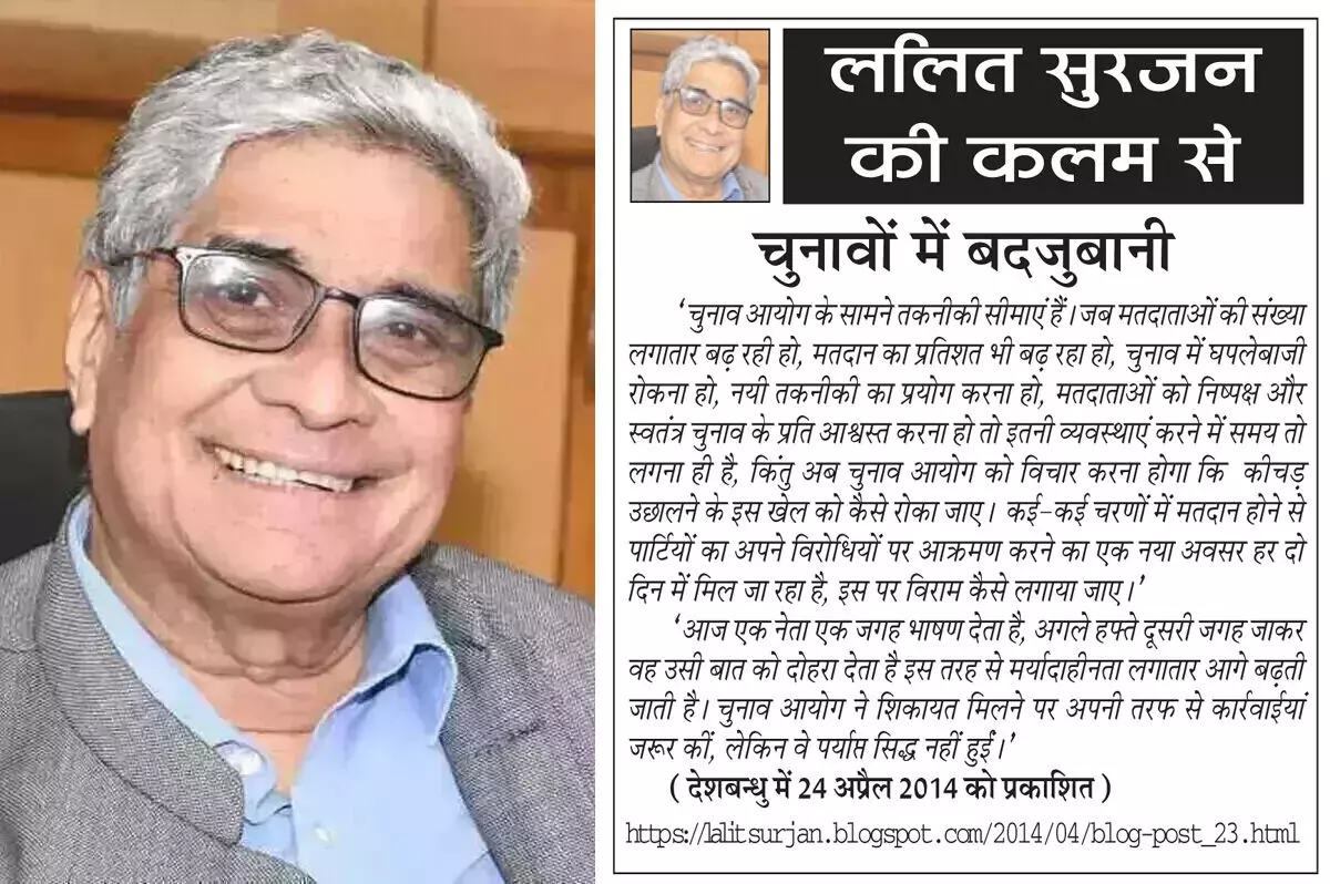 'चुनाव आयोग के सामने तकनीकी सीमाएं हैं। जब मतदाताओं की संख्या लगातार बढ़ रही हो, मतदान का प्रतिशत भी बढ़ रहा हो, चुनाव में घपलेबाजी रोकना हो, नयी तकनीकी का प्रयोग करना हो, मतदाताओं को निष्पक्ष और स्वतंत्र चुनाव के प्रति आश्वस्त करना हो तो इतनी व्यवस्थाएं करने में समय तो लगना ही है, किंतु अब चुनाव आयोग को विचार करना होगा कि कीचड़ उछालने के इस खेल को कैसे रोका जाए। कई-कई चरणों में मतदान होने से पार्टियों का अपने विरोधियों पर आक्रमण करने का एक नया अवसर हर दो दिन में मिल जा रहा है, इस पर विराम कैसे लगाया जाए।'