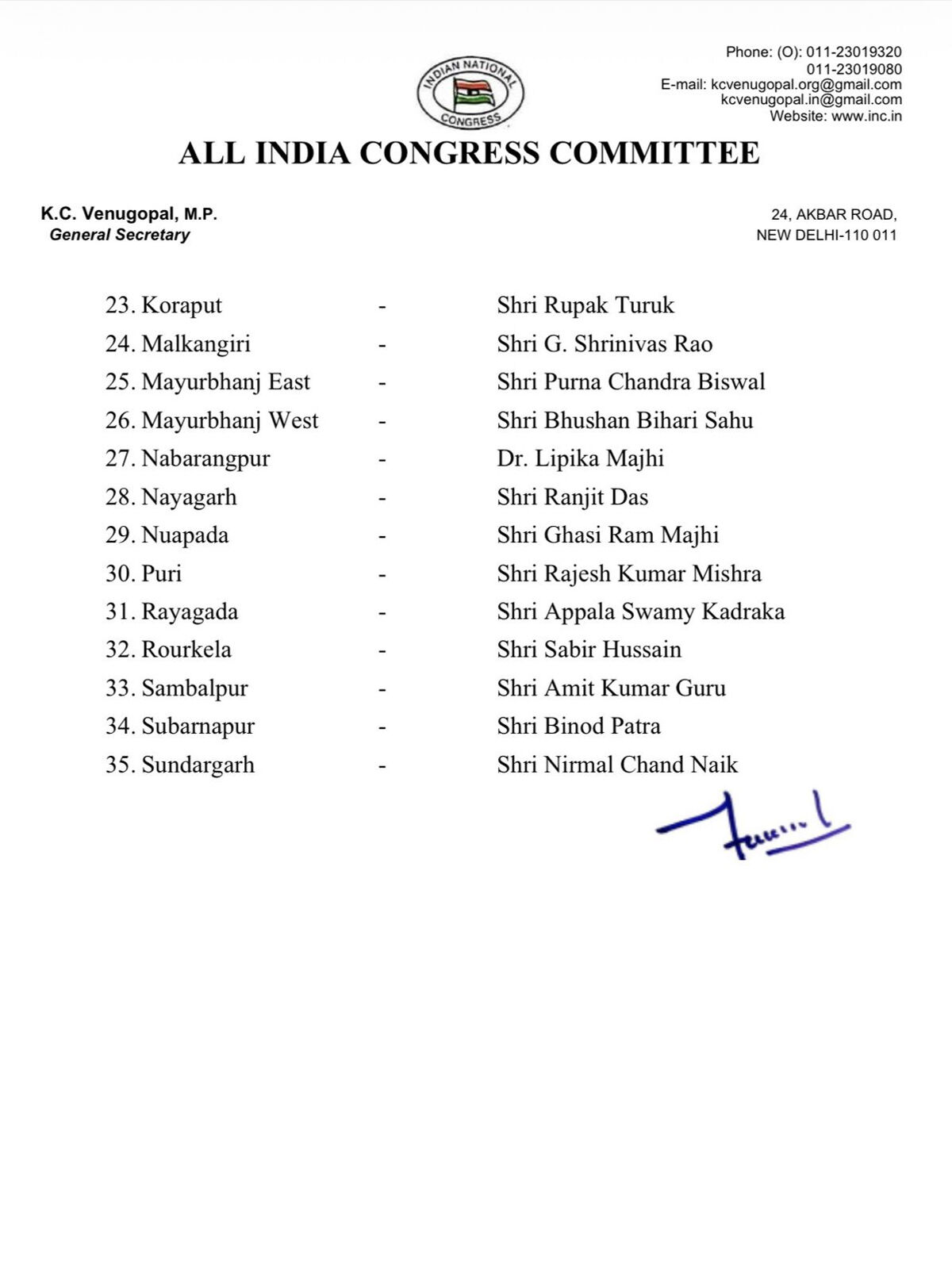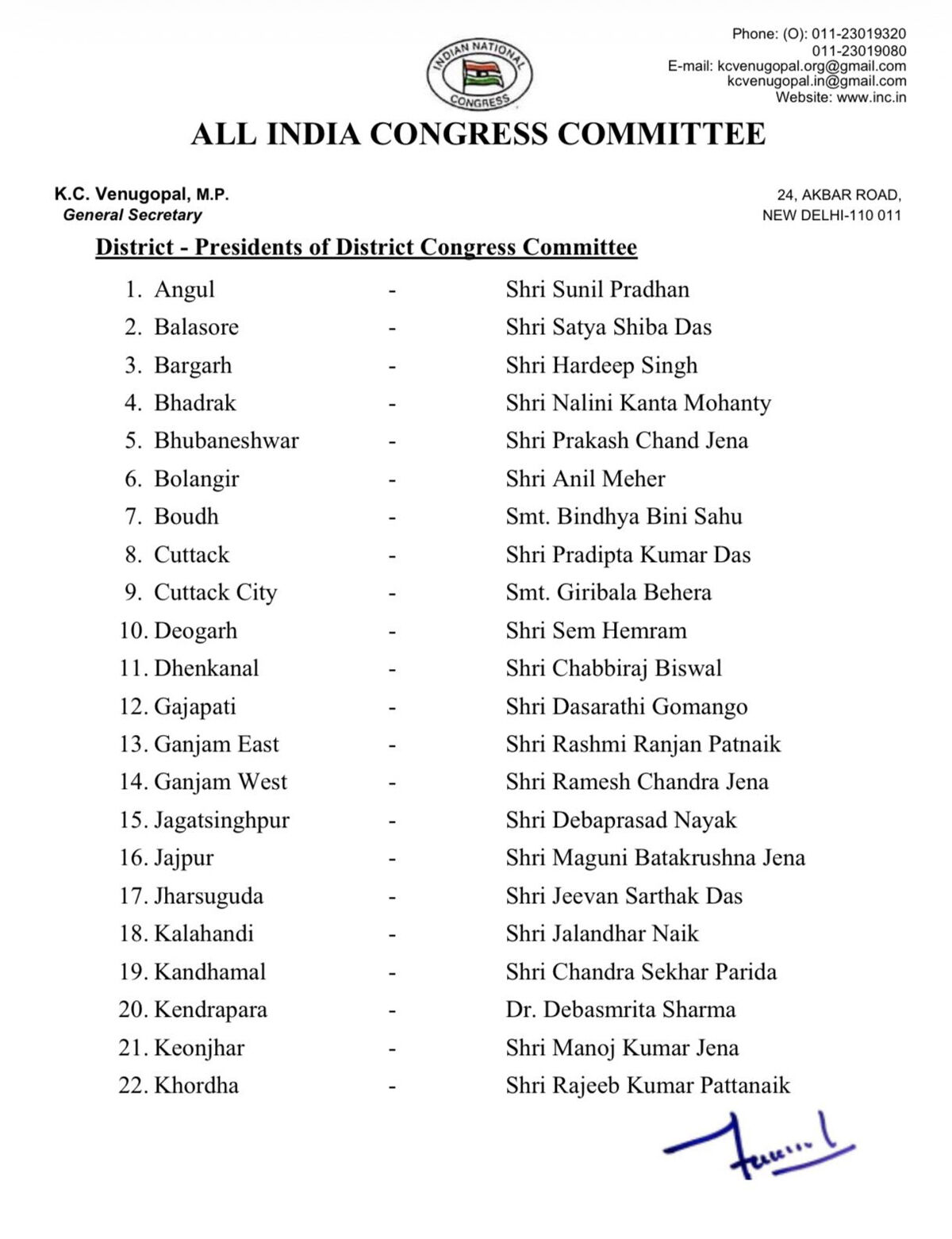 कांग्रेस ने ओडिशा के जिला अध्यक्षों के नामों का ऐलान कर दिया है। इसे लेकर पार्टी के महासचिव केसी वेणुगोपाल ने एक पत्र जारी किया है;