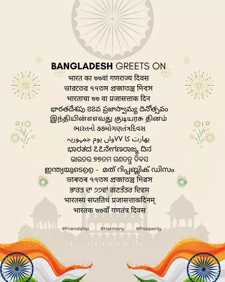 भारत में बांग्लादेश के हाई कमिश्नर, रियाज हमीदुल्लाह ने एक तस्वीर साझा करते हुए लिखा था, "बांग्लादेश 77वें गणतंत्र दिवस पर भारत में हर महिला-पुरुष-बच्चे को बधाई देता है।" खास बात यह है कि भारत में बांग्लादेश के हाई कमिश्नर ने गणतंत्र दिवस की यह बधाई 14 भाषाओं में दी है।