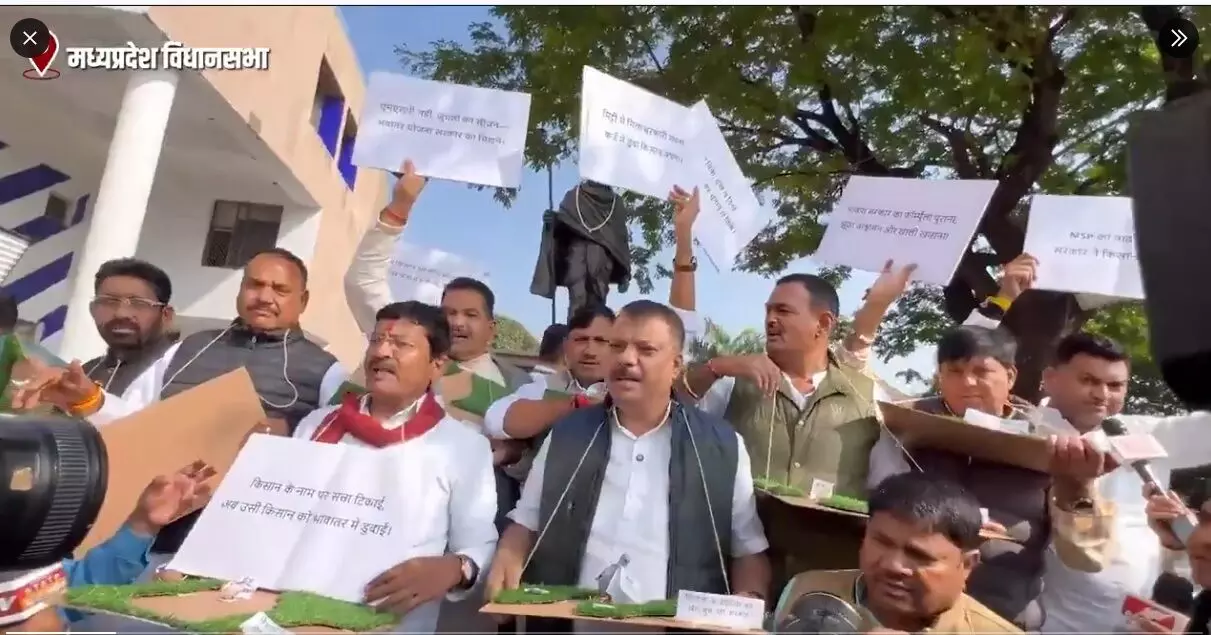 भोपाल। मध्यप्रदेश विधानसभा के शीतकालीन सत्र के दूसरे दिन कांग्रेस विधायकों ने किसानों की समस्याओं को लेकर भाजपा सरकार के खिलाफ प्रदर्शन किया। कांग्रेस के विधायकों ने विधानसभा की कार्रवाई शुरू होने से पहले नेता प्रतिपक्ष उमंग सिंघार के नेतृत्व में प्रदेश के किसानों की समस्या, उनकी उपेक्षा और भाजपा सरकार की किसान-विरोधी नीतियों के खिलाफ जोरदार सांकेतिक प्रदर्शन किया।