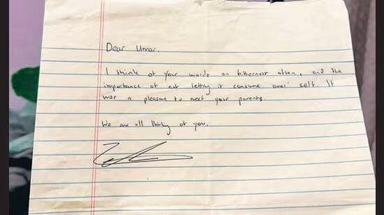 न्यूयॉर्क सिटी के मेयर जोहरान ममदानी ने उमर खालिद के नाम चिट्ठी लिखी है। उन्होंने लिखा, “‘प्रिय उमर, मैं अक्सर आपकी उन बातों को याद करता हूं, जिनमें आपने कड़वाहट को खुद पर हावी न होने देने और हालात को बड़े नजरिए से देखने की बात कही थी. आपके माता-पिता से मिलकर खुशी हुई. हम सभी आपके बारे में सोच रहे हैं।”