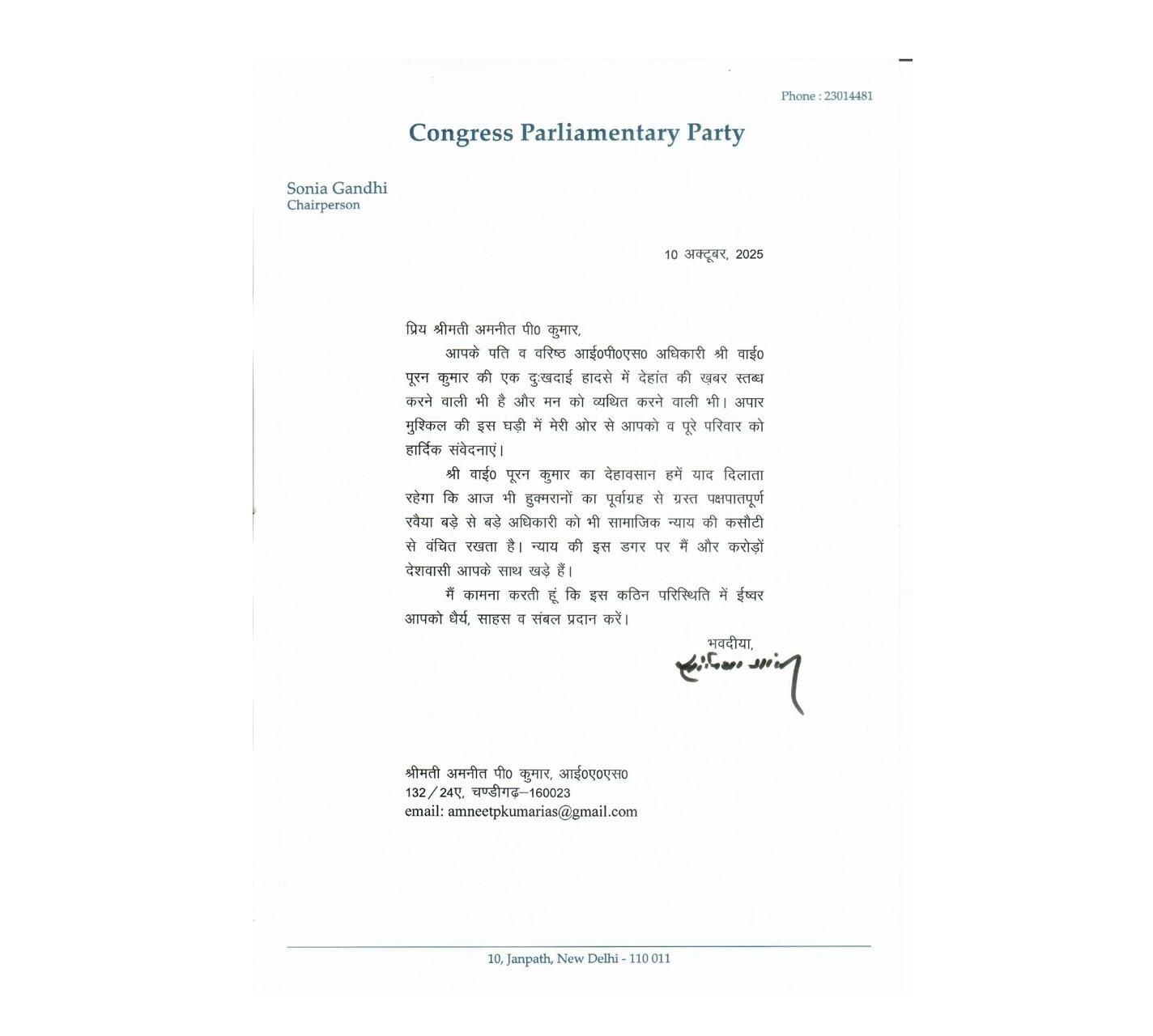 सोनिया गांधी ने अमनीत पी. कुमार को लिखे पत्र में कहा, “ आपके पति और वरिष्ठ आईपीएस अधिकारी वाई पूरन कुमार की दुखद दुर्घटना में मृत्यु का समाचार अत्यंत पीड़ादायक और मन को व्यथित करने वाला है। इस कठिन समय में मेरी और कांग्रेस संसदीय दल की ओर से आपको और आपके पूरे परिवार को हार्दिक संवेदना।"