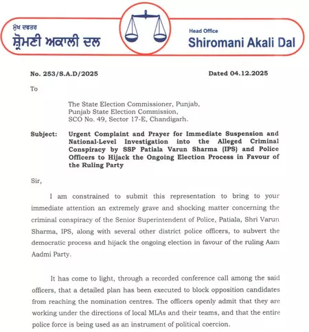 इस पत्र में दावा किया गया है कि पुलिस अधिकारी लोकतंत्र को नुकसान पहुंचाने वाली एक आपराधिक साजिश में शामिल हैं, जिसका खुलासा एक रिकॉर्डेड कॉन्फ्रेंस कॉल से हुआ है। अकाली दल ने इन अधिकारियों को तुरंत निलंबित करने और मामले की राष्ट्रीय स्तर पर जांच की मांग की है, ताकि चुनाव निष्पक्ष रह सकें।
