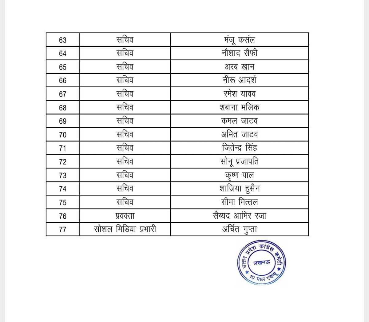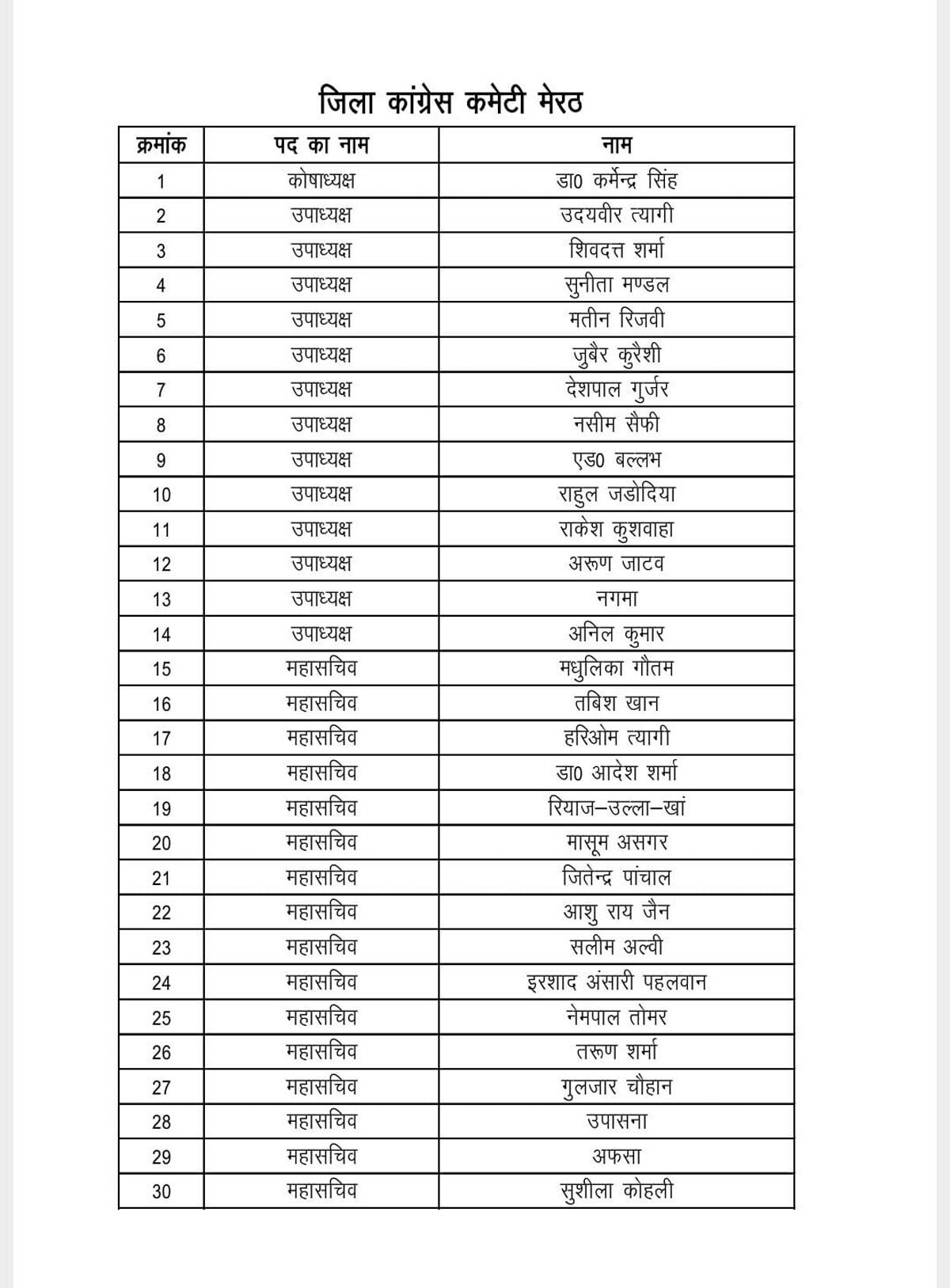 उत्तर प्रदेश के जिला मेरठ कांग्रेस कमेटी की कार्यकारिणी घोषित