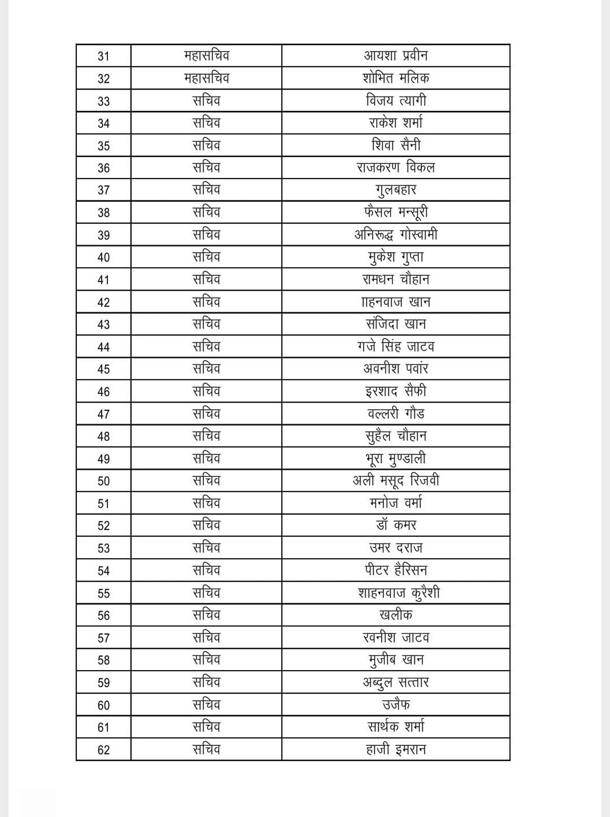मेरठ। उत्तर प्रदेश कांग्रेस कमेटी के प्रदेश अध्यक्ष अजय राय ने जिला कांग्रेस कमेटी मेरठ की कार्यकारिणी घोषित की। जिसमें कोषाध्यक्ष डॉक्टर कर्मेंद्र सिंह, प्रवक्ता सय्यद आमिर रजा, सोशल मीडिया प्रभारी अर्चित गुप्ता के साथ साथ 13 उपाध्यक्ष, 18 महासचिव एवं 43 सचिव नियुक्त किए गए हैं।