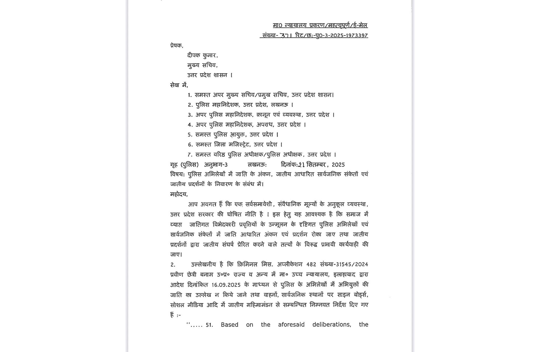 गौरतलब है कि एक दिन पूर्व कार्यवाहक मुख्य सचिव दीपक कुमार ने राज्य में जातिगत गत भेदभाव समाप्त करने के लिए सार्वजनिक स्थानों पर जाति के उल्लेख करने पर रोक लगाने का आदेश जारी किया था। यह आदेश इलाहाबाद हाईकोर्ट के आदेश के अनुपालन में जारी किया गया था। दरअसल, पिछले दिनों इलाहाबाद हाईकोर्ट ने सरकार को आदेश दिए थे कि पुलिस रिकॉर्ड व सार्वजनिक स्थलों पर लोगों के नाम के साथ जाति के उल्लेख पर रोक लगाई जाए।