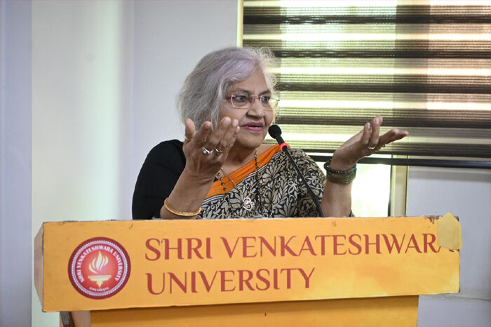 अपने सम्बोधन में वेंक्टेश्वरा समूह के संस्थापक अध्यक्ष श्री सुधीर गिरि ने कहा कि देश के सर्वोच्च संवैधानिक राष्ट्रपति पद पर महामहिम द्रापदी मुर्मू एवं उत्तर प्रदेश के राज्यपाल पद पर आदरणीया महामहिम आनंदी बेन पटेल का आसीन होना इस बात का परिचायक है कि आज भारत में महिलायें शिखर पर स्थापित है। आदरणीय प्रधानमंत्री जी की ’’बेटी बचाओ-बेटी पढ़ाओ-बेटी खिलाओ’’ एवं ’’नारी वंदन’’ जैसी शानदार योजनाओं से देश में मातृशक्ति का सम्मान बढ़ा है। प्रतिकुलाधिपति डाॅ0 राजीव त्यागी ने कहा कि सदियो से ही भारत में मातृशक्ति का वंदन होता रहा है एवं मातृशक्ति हमेशा वंदनीय रहेगी।