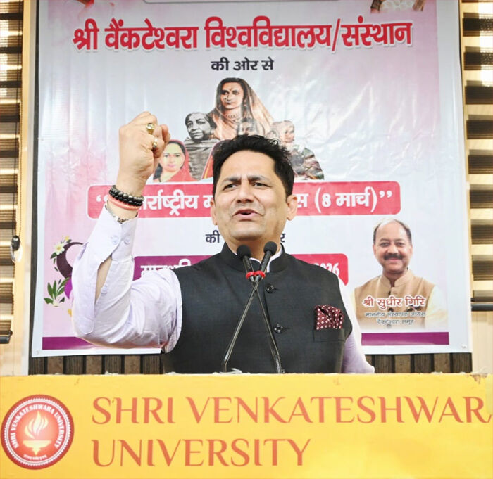 मेरठ। आज राष्ट्रीय राजमार्ग बाईपास स्थित वेंक्टेश्वरा संस्थान में अंतर्राष्ट्रीय महिला दिवस की पूर्व संध्या पर ’’वेंक्टेश्वरा मातृशक्ति सम्मान समारोह-2026’’ का शानदार आयोजन किया गया। इस समारोह में मातृशक्ति के सम्मान में विश्वविद्यालय के छात्र-छात्राओ ने काव्य पाठ समेत विभिन्न शानदार प्रस्तुतियाँ देकर इस कार्यक्रम को यादगार बना दिया। इसके साथ ही अलग-अलग क्षेत्रों में उल्लेखनीय कार्य करने वाली तीन दर्जन महिलाओं को पटका, पगड़ी एवं स्मृति चिन्ह देकर ’’वेंक्टेश्वरा मातृशक्ति सम्मान समारोह-2026’’ से सम्मानित किया गया। इस अवसर पर राजयोग एवं आध्यात्म के क्षेत्र में मातृशक्ति द्वारा नियंत्रित एवं शक्ति विश्व की सबसे बड़ी संस्था ब्रहमकुमारी की तीन दर्जन से अधिक बहनों को भी पटका, पगड़ी एवं तुलसी माला देकर सम्मानित किया गया।