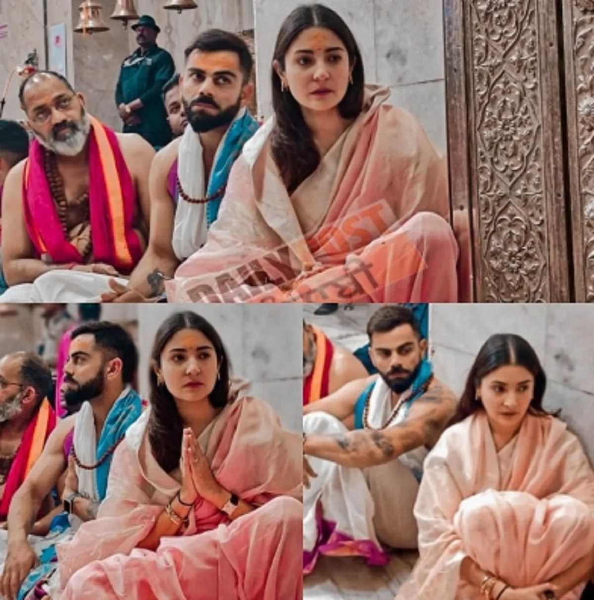 जहां अनुष्का हल्के गुलाबी रंग की साड़ी पहने नजर आईं, वहीं विराट कोहली धोती और गले में रुद्राश्र की माला पहने हुए दिखाई दिए। उनके साथ मंदिर के पुजारी भी बैठे हुए नजर आए।