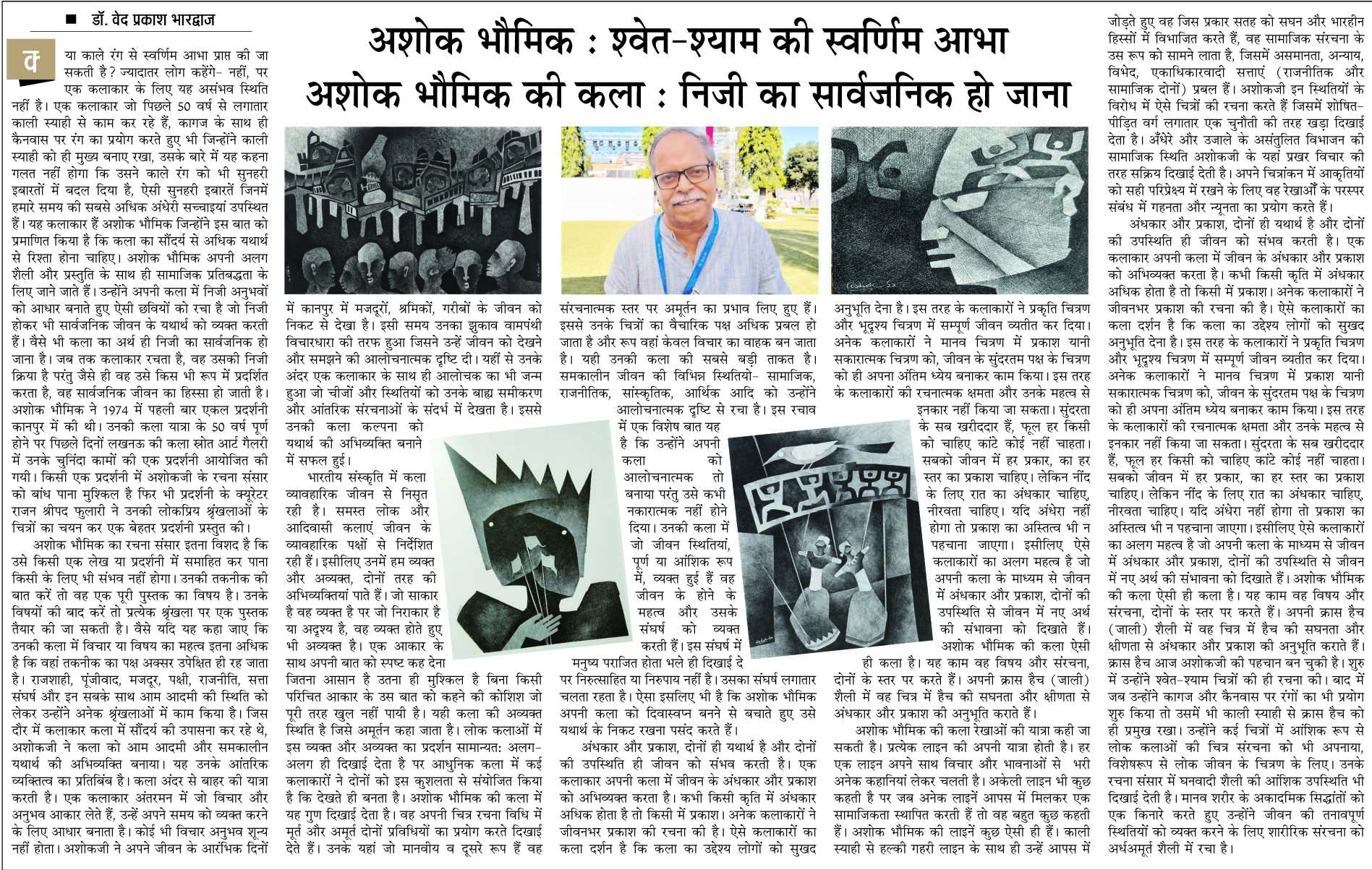 अशोक भौमिक अपनी अलग शैली और प्रस्तुति के साथ ही सामाजिक प्रतिबद्धता के लिए जाने जाते हैं। उन्होंने अपनी कला में निजी अनुभवों को आधार बनाते हुए ऐसी छवियों को रचा है जो निजी होकर भी सार्वजनिक जीवन के यथार्थ को व्यक्त करती हैं। वैसे भी कला का अर्थ ही निजी का सार्वजनिक हो जाना है। जब तक कलाकार रचता है, वह उसकी निजी क्रिया है परंतु जैसे ही वह उसे किस भी रूप में प्रदर्शित करता है, वह सार्वजनिक जीवन का हिस्सा हो जाती है। अशोक भौमिक ने 1974 में पहली बार एकल प्रदर्शनी कानपुर में की थी। उनकी कला यात्रा के 50 वर्ष पूर्ण होने पर पिछले दिनों लखनऊ की कला स्रोत आर्ट गैलरी में उनके चुनिंदा कामों की एक प्रदर्शनी आयोजित की गयी। किसी एक प्रदर्शनी में अशोकजी के रचना संसार को बांध पाना मुश्किल है फिर भी प्रदर्शनी के क्यूरेटर राजन श्रीपद फुलारी ने उनकी लोकप्रिय श्रृंखलाओं के चित्रों का चयन कर एक बेहतर प्रदर्शनी प्रस्तुत की।