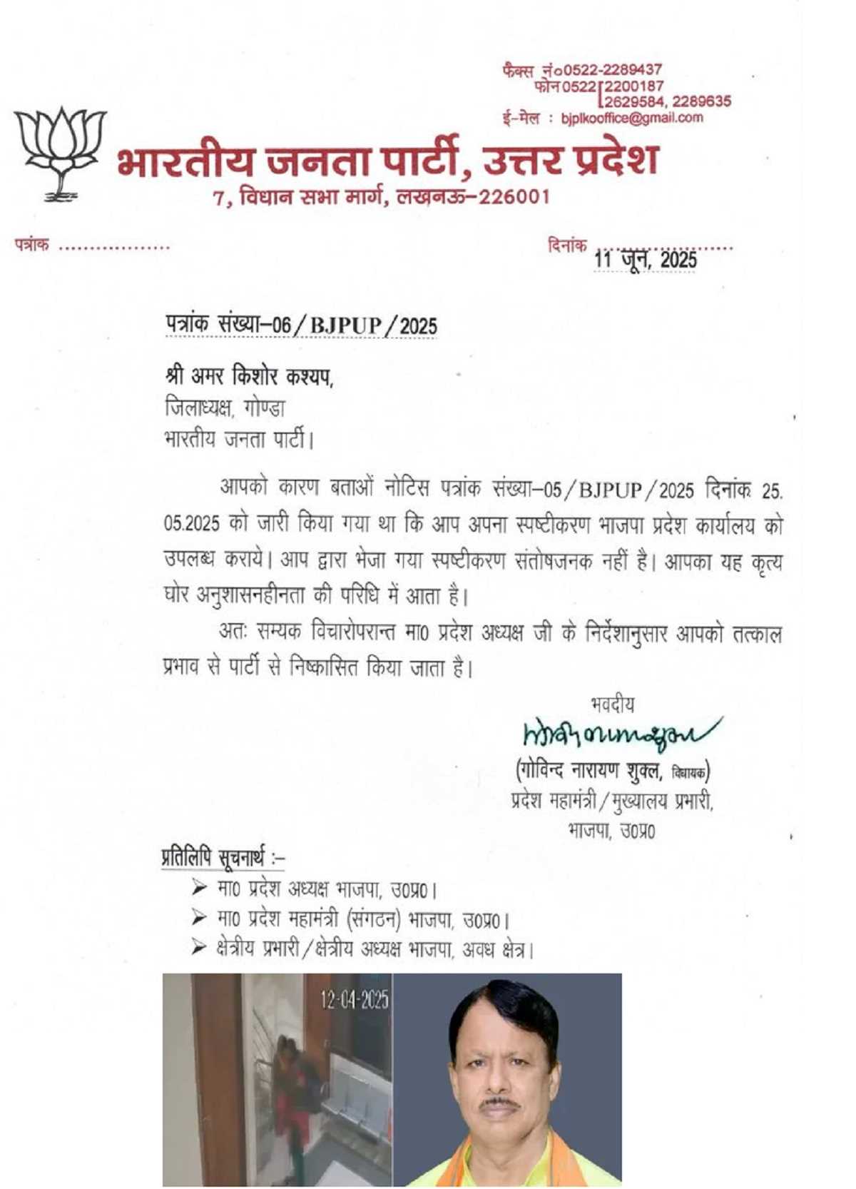 भाजपा ने गोंडा के जिलाध्यक्ष अमर किशोर कश्यप को पार्टी से निष्कासित
