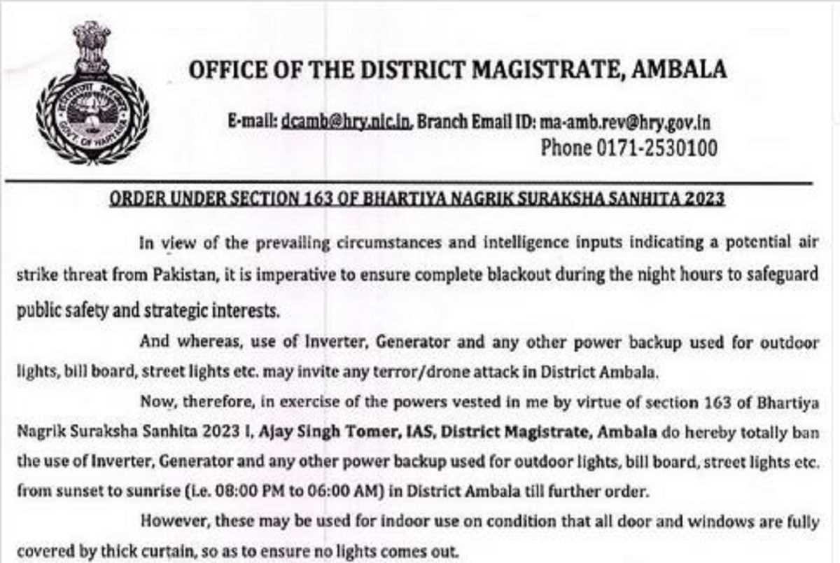 अंबाला जिला मजिस्ट्रेट के भारतीय नागरिक सुरक्षा संहिता की धारा 163 के जारी आदेश के अनुसार रात आठ बजे से सुबह छह बजे तक पूरी तरह ब्लैकआउट रहेगा। इस दौरान घरों से बाहर रोशनी के लिए, दुकानों/संस्थानों के बोर्ड, स्ट्रीट लाइट के लिए इनवर्टर और जनरेटर या किसी तरह के पावर बैकअप का इस्तेमाल भी नहीं किया जा सकेगा।