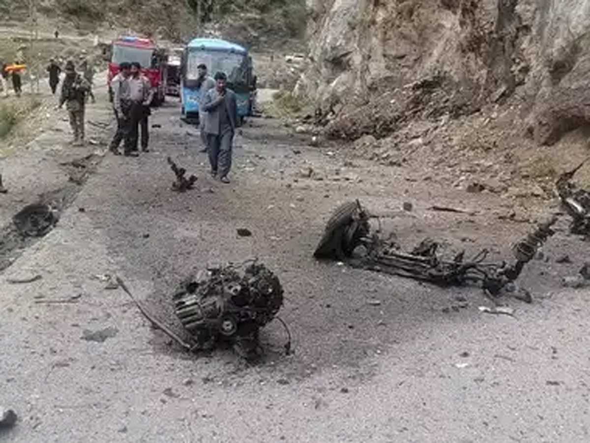 डॉन ने एक बचाव अधिकारी के हवाले से कहा कि विस्फोट के बाद चीनी नागरिकों को लेकर जा रहा वाहन एक खाई में गिर गया और उसमें आग लग गई।