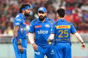 हर्षल की धीमी गेंद पर एलबीडब्ल्यू आउट होने से पहले, रोहित ने अर्शदीप सिंह की गेंद पर पुल खेलते हुए 80 मीटर का छक्का लगाया। मुंबई ने पहले पावर-प्ले में एक विकेट पर 54 रन बनाये।