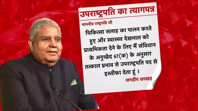 बहरहाल, राज्यसभा में सोमवार दोपहर करीब 12 बजे के इस घटनाक्रम के बाद भी पूरा दिन सामान्य तरीके से ही बीता, लेकिन रात को अचानक खबर आई कि भारत के उपराष्ट्रपति और राज्यसभा सभापति जगदीप धनखड़ ने अपने पद से अचानक इस्तीफा दे दिया। इस खबर से राजनैतिक गलियारों में हलचल मच गई। जगदीप धनखड़ ने राष्ट्रपति द्रौपदी मुर्मू को लिखे अपने पत्र में कहा, 'सेहत की देखभाल को महत्व देने और डॉक्टरी सलाह का पालन करने के लिए, मैं भारत के उपराष्ट्रपति के पद से तत्काल प्रभाव से इस्तीफा देता हूं, जैसा कि संविधान के अनुच्छेद 67(ए) में प्रावधान है।' इसके आगे उन्होंने राष्ट्रपति और प्रधानमंत्री समेत सबका आभार जताया। गौरतलब है कि श्री धनखड़ मार्च में ही हृदय रोग संबंधी बीमारी से पीड़ित हुए थे, उनका इलाज भी चला था। लेकिन इसके बाद वे जल्द ही सार्वजनिक कार्यक्रमों में नजर आने लगे थे। वैसे भी इस्तीफे के इस कारण पर भरोसा नहीं किया जा रहा है, क्योंकि अगर ऐसी कोई बात थी तो फिर संसद का मानसून सत्र शुरु होने से पहले ही उन्होंने इस्तीफा क्यों नहीं दिया। क्यों सत्र शुरु होने के साथ ही उन्हें स्वास्थ्य की चिंता हुई। इस इस्तीफे के वक्त और हालात दोनों संदिग्ध हैं।