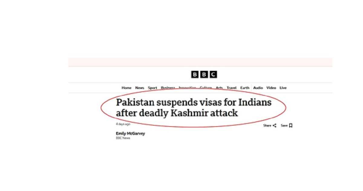 सरकार ने बीबीसी वेबसाइट में 'पाकिस्तान सस्पेंड वीजा फॉर इंडियंस आफ्टर डेडली कश्मीर अटैक (पाकिस्तान ने कश्मीर में घातक हमले के बाद भारतीयों के लिए वीजा निलंबित किया)' शीर्षक से छपी खबर के बारे में चेतावनी दी।
