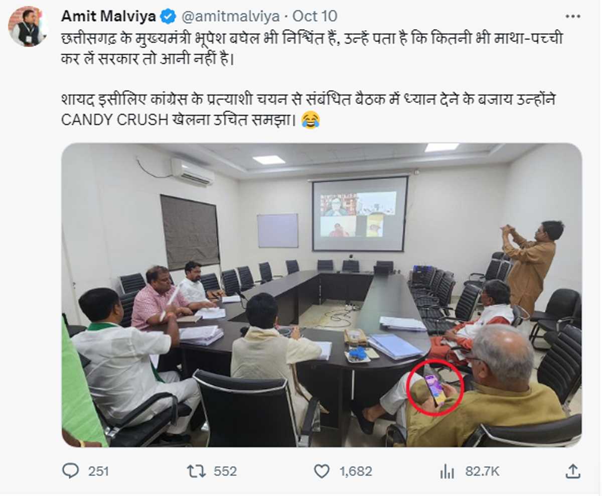 विधानसभा चुनाव सिर पर हैं और उसके बाद लोकसभा चुनाव के लिए जनता के बीच फिर से जाना है। देश के राजनैतिक माहौल में इस वक्त सारी चिंताओं से बढ़कर सबसे बड़ी चिंता चुनावों की ही नजर आ रही है। जो सत्ता में है वो उस पर किसी भी तरह से बने रहने की कोशिश में है, जो नहीं है, उसका सारा ध्यान इसी बात पर है कि किसी भी तरह सत्ता में लौटा जाए। भाजपा के लिए भी यही चिंता इस वक्त दिखाई दे रही है, लेकिन भाजपा नेता अमित मालवीय का एक ट्वीट आया है, जिसे देखकर समझ आता है कि भाजपा की चिंता सत्ता में बने रहना तो है ही, कांग्रेस और कांग्रेस के नेता उसके लिए सबसे बड़ी चिंता बने हुए हैं। तभी तो कांग्रेस की हर छोटी-बड़ी बात पर भाजपा चील जैसी पैनी निगाह रख रही है। अपने एक ट्वीट में अमित मालवीय ने छत्तीसगढ़ के मुख्यमंत्री भूपेश बघेल की एक तस्वीर डालते हुए लिखा है-कितनी भी माथा-पच्ची कर लें, सरकार तो आनी नहीं है इसलिए कैंडी क्रश खेल रहे हैं। दरअसल प्रदेश चुनाव समिति की एक बैठक में किसी ने मुख्यमंत्री बघेल की यह तस्वीर खींची है।