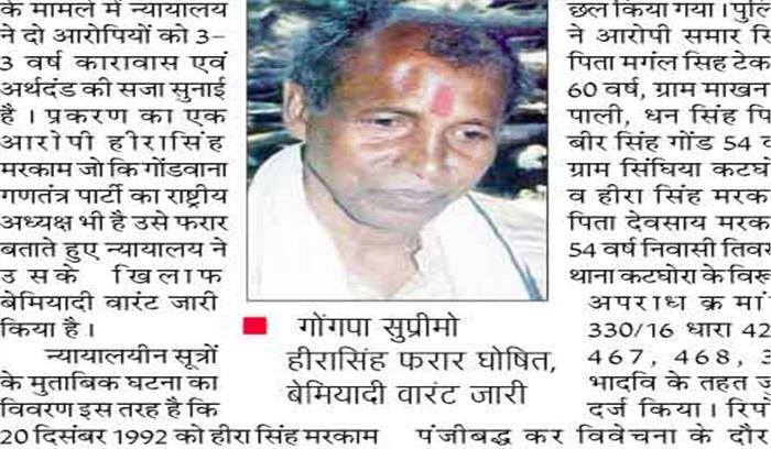 कोरबा-कटघोरा ! गोंडवाना बैंक खोलकर खाताधारकों से रूपये जमा कराने और बाद में वापस नहीं करते हुए कूटरचना पूर्वक दस्तावेज तैयार कर छल करने के मामले में न्यायालय ने दो आरोपियों को 3-3 वर्ष कारावास एवं अर्थदंड की सजा सुनाई है। प्रकरण का एक आरोपी हीरासिंह मरकाम जो कि गोंडवाना गणतंत्र पार्टी का राष्ट्रीय अध्यक्ष भी है उसे फरार बताते हुए न्यायालय ने उसके खिलाफ बेमियादी वारंट जारी किया है।