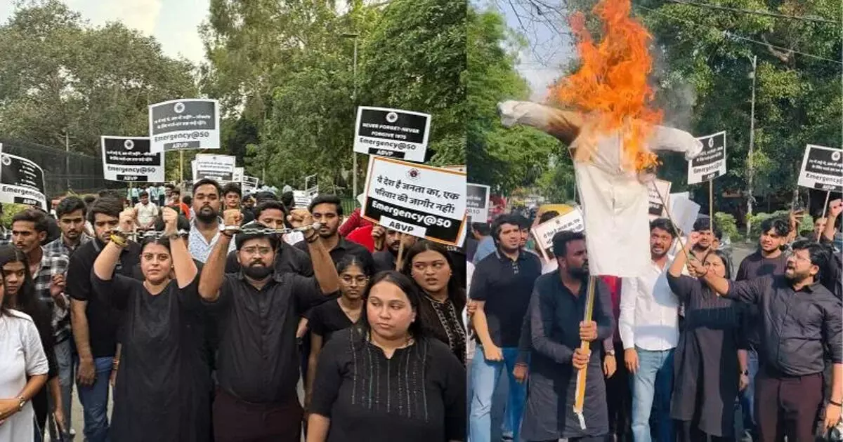 अखिल भारतीय विद्यार्थी परिषद (अभाविप) ने दिल्ली विश्वविद्यालय के मॉरिश चौक पर सैकड़ों की संख्या में आपातकाल का पुतला दहन कर विरोध-प्रदर्शन किया
