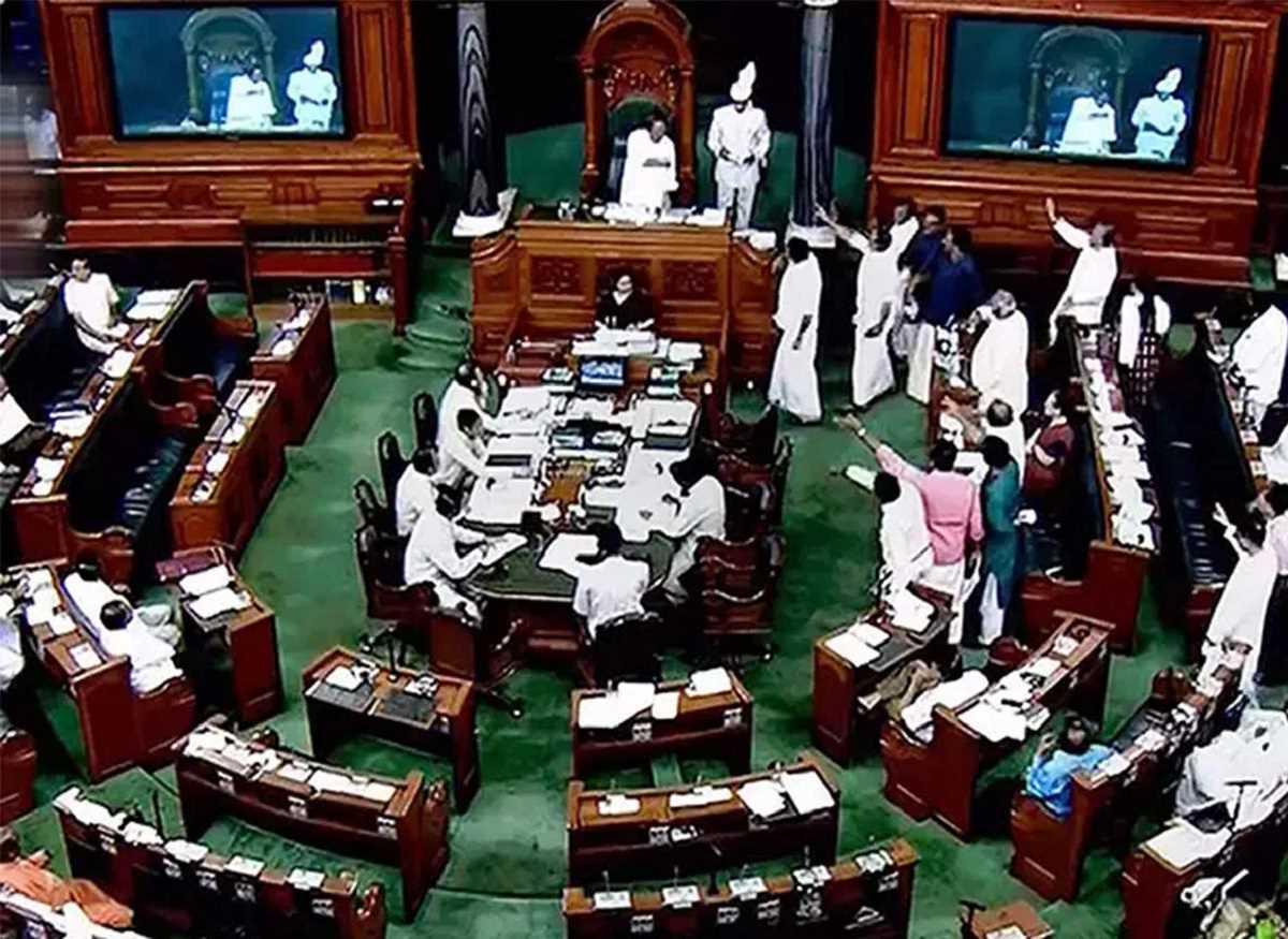 पीठासीन अधिकारी ने एक बार के स्थगन के बाद दो बजे जैसे ही सदन की कार्यवाही शुरू की, काले कपड़े पहने कांग्रेस तथा द्रमुक के सदस्य सदन के बीचों बीच आकर नारेबाजी करने लगे। तृणमूल कांग्रेस के सांसद काले रंग का मास्क पहनकर सदन में आए थे। पीठासीन अधिकारी ने हंगामे के बीच जरूरी कागजात पटल पर रखवाये।