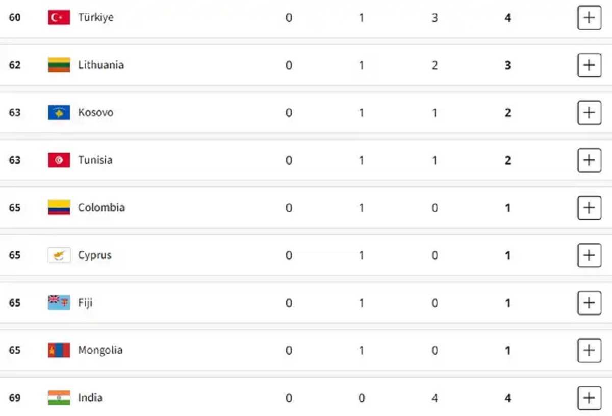 पदक तालिका : अमेरिका शीर्ष पर, भारत 69वें स्थान पर