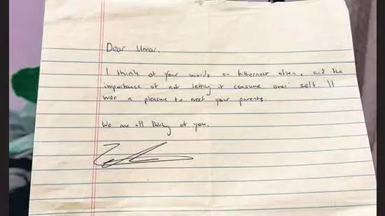 अमेरिका में ख़ालिद के माता-पिता को सौंपी चिट्ठी
