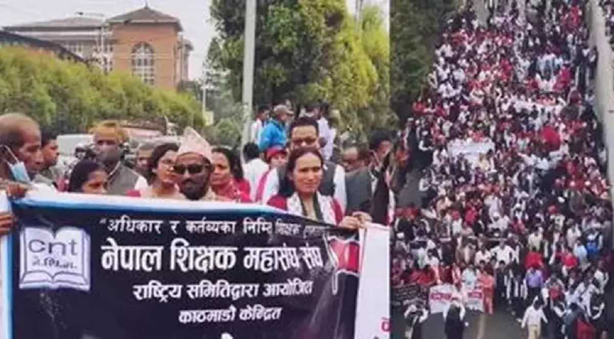 रिपोर्ट्स से पता चलता है कि देश भर से शिक्षक काठमांडू में स्कूल शिक्षा अधिनियम को लागू करने की मांग को लेकर इक्ट्ठा हुए, जो सरकार की पिछली प्रतिबद्धताओं के बावजूद संसद में लंबित पड़ा हुआ है।