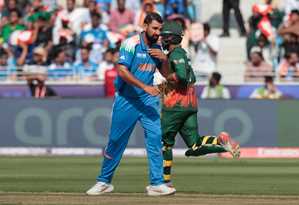 हालांकि शमी ने तंजीम हसन साकिब का स्टंप उखाड़ दिया, लेकिन ऐंठन और मुश्किल से हिल रहे हृदॉय ने चार रन के लिए ड्राइव मारा और 114 गेंदों में अपना पहला वनडे शतक पूरा किया। शमी ने आखिरकार पांच विकेट लिए, जब तस्कीन अहमद ने डीप मिड-विकेट पर सीधा शॉट खेला, इससे पहले हर्षित ने हृदॉय को शॉर्ट फाइन लेग पर टॉप-एज करके चैंपियंस ट्रॉफी में अपने डेब्यू पर तीन विकेट चटकाए।