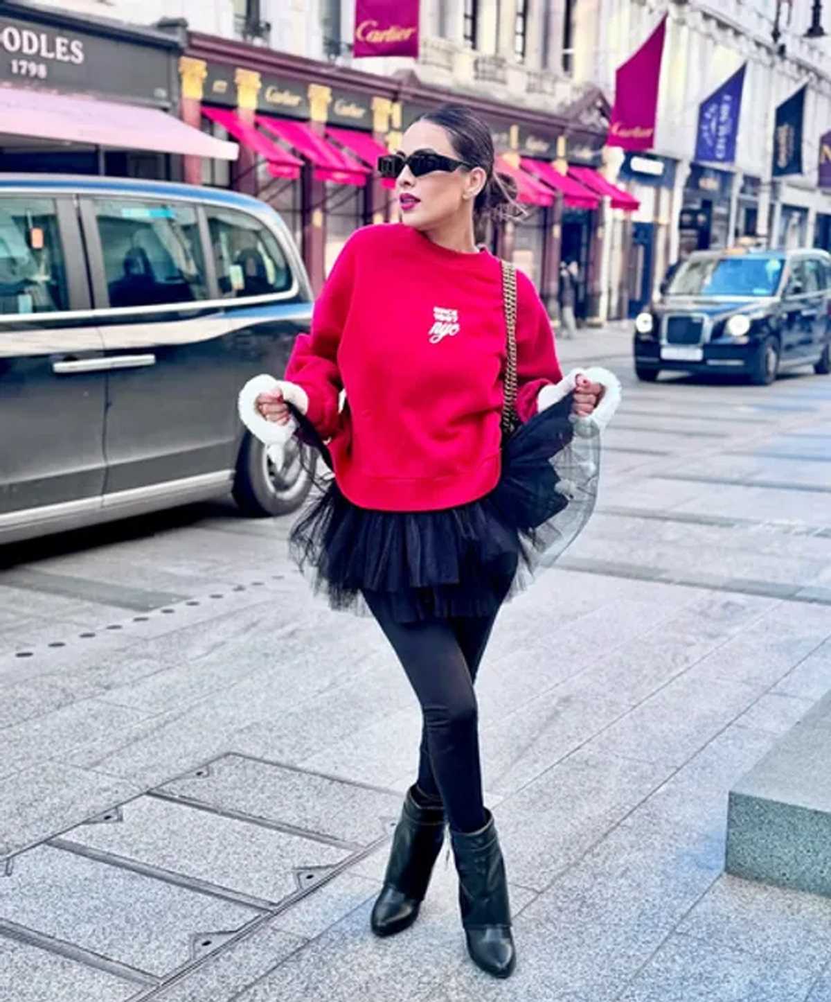 निया शर्मा ने इंस्टाग्राम पर तस्वीरें शेयर कीं, जिसमें वह सड़क पर पोज देती नजर आईं, जिसमें वह ब्लैक और रेड कलर की स्वेटशर्ट, लेगिंग्स, मैचिंग जूते और हैंडबैग में दिखीं। अपने लुक को और निखारने के लिए निया ने बालों को मेसी बन में बांधा था। इसके साथ ही वह ब्लैक कलर के चश्मे को लगाए नजर आईं।