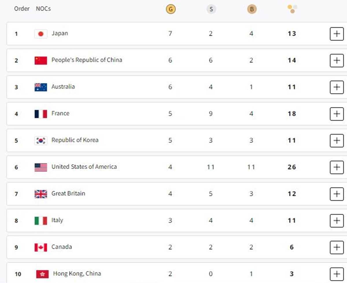पेरिस ओलंपिक के पांचवें दिन जापान ने 7 गोल्ड, 2 सिल्वर और 4 ब्रॉन्ज मेडल के साथ मेडल टैली में अपना टॉप स्थान बनाए रखा, जिससे उसके कुल मेडलों की संख्या 13 हो गई