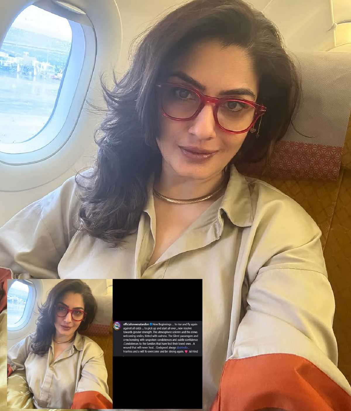 रवीना ने हादसे में जान गंवाने वालों के परिवारों के प्रति संवेदना जताई और एयर इंडिया को निडर होकर आगे बढ़ने की शुभकामनाएं दीं। इंस्टाग्राम पर विमान के अंदर की तस्वीरों को शेयर करते हुए अभिनेत्री ने कैप्शन में लिखा, "नई शुरुआत...सभी बाधाओं के बावजूद फिर से उड़ान भरना और मजबूत होना। सवारियों का सन्नाटा और क्रू की मुस्कान में दुख की छाया थी। यात्रियों और क्रू के बीच चुपके से संवेदनाएं दिख रही हैं।”