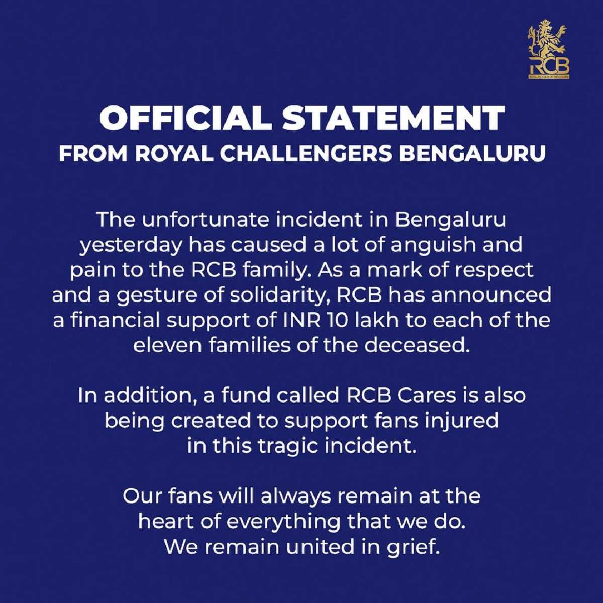 आरसीबी ने गुरूवार को जारी आधिकारिक बयान में कहा, '' बेंगलुरु में हुई इस भगदड़ की घटना से हमें गहरा दुःख और पीड़ा पहुंची है। घटना में मारे गए 11 लोगों के परिवारों के प्रति संवेदना प्रकट करते हुए हम हर एक को 10 लाख रुपये की मदद देने की घोषणा करते हैं।''