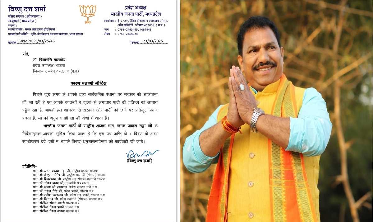 मध्यप्रदेश में पिछले कुछ समय से अपनी ही सरकार को घेरते आ रहे भारतीय जनता पार्टी विधायक और पूर्व सांसद डॉ चिंतामणि मालवीय को पार्टी प्रदेश अध्यक्ष विष्णुदत्त शर्मा ने कारण बताओ नोटिस जारी करते हुए उनसे सात दिन में उनके कथित कृत्यों को लेकर जवाब मांगा है