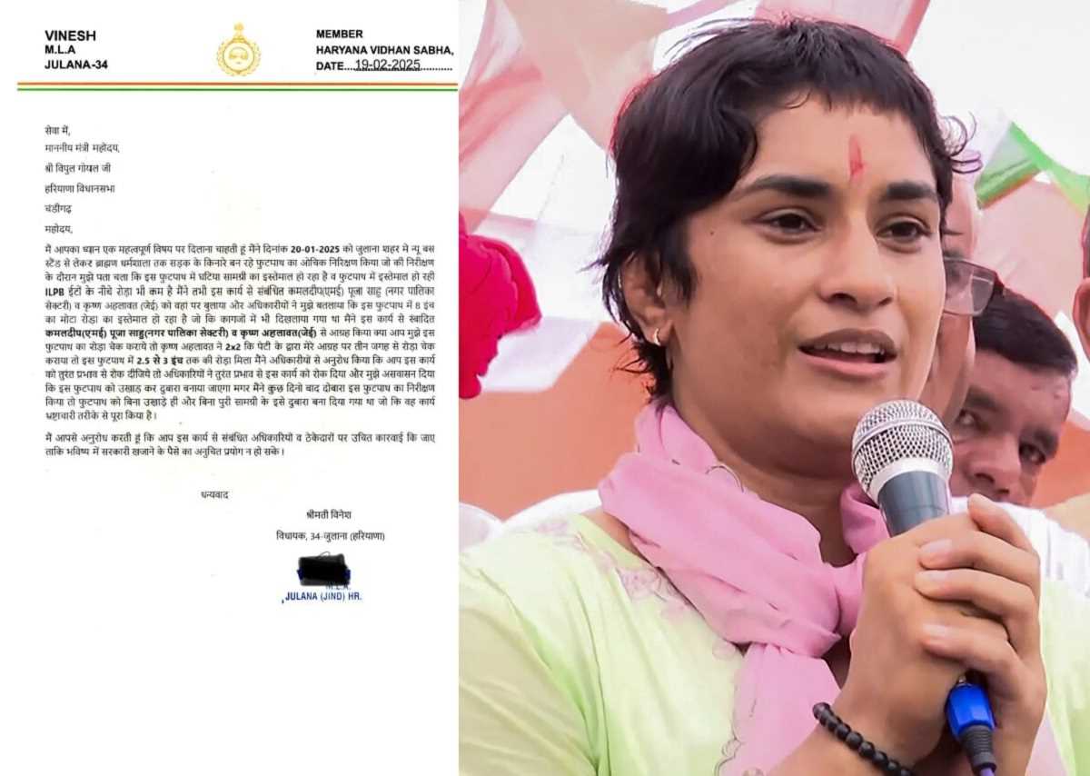 इसमें फोगाट ने कहा कि जुलाना में भ्रष्टाचार एक अलग ही लेवल पर चल रहा है। आपकी सरकार अधिकारियों पर कार्रवाई करेगी, इस उम्मीद से वह पत्र लिख रही हैं। विनेश फोगाट ने इस पत्र को अपने सोशल मीडिया अकाउंट पर भी शेयर किया है। निकाय मंत्री विपुल गोयल को लिखे पत्र में विधायक और रेस्लर विनेश फोगाट ने कहा कि पिछले माह 20 जनवरी को उन्होंने जींद के जुलाना में नए बस स्टैंड से लेकर ब्राह्मण धर्मशाला तक सड़क के किनारे फुटपाथ का औचक निरीक्षण किया गया था। इसमें फुटपाथ के निर्माण में बहुत ही घटिया स्तर के मटीरियल का प्रयोग किया जा रहा था।