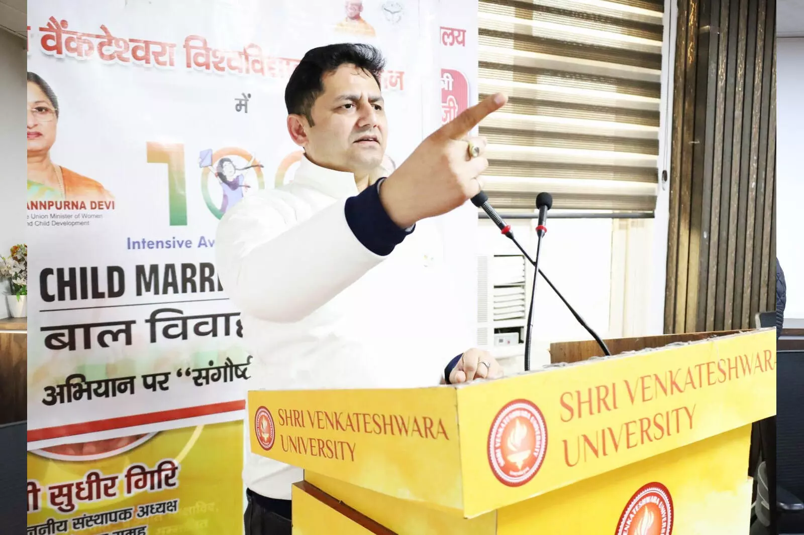 श्री वैंकटेश्वरा विश्वविद्यालय / संस्थान के डा. सी.वी. रमन सभागार में “बाल विवाह मुक्त भारत” अभियान के अवसर पर आयोजित संगोष्ठी एवं शपथ समारोह का शुभारम्भ प्रतिकुलाधिपति डा. राजीव त्यागी, महिला कल्याण विभाग की केंद्र प्रबंधक ममता दुबे एवं वरिष्ठ परामर्शदात्री करूणानिधि, डा. यतीन्द्र कटारिया आदि ने सरस्वती माँ की प्रतिमा के सन्मुख दीप प्रज्ज्वलित करके एवं हरी झण्डी दिखाकर किया | अपने सम्बोधन में संस्थापक अध्यक्ष श्री सुधीर गिरि ने कहा कि यदि सही मायने में भी देश को विकसित भारत बनाना है तो बाल विवाह जैसे राष्ट्रीय कलंक को पूरी तरह मिटाकर देश के सभी बच्चों के हाथों में स्कूल बैग एवं खेल का सामान होना चाहिए |
