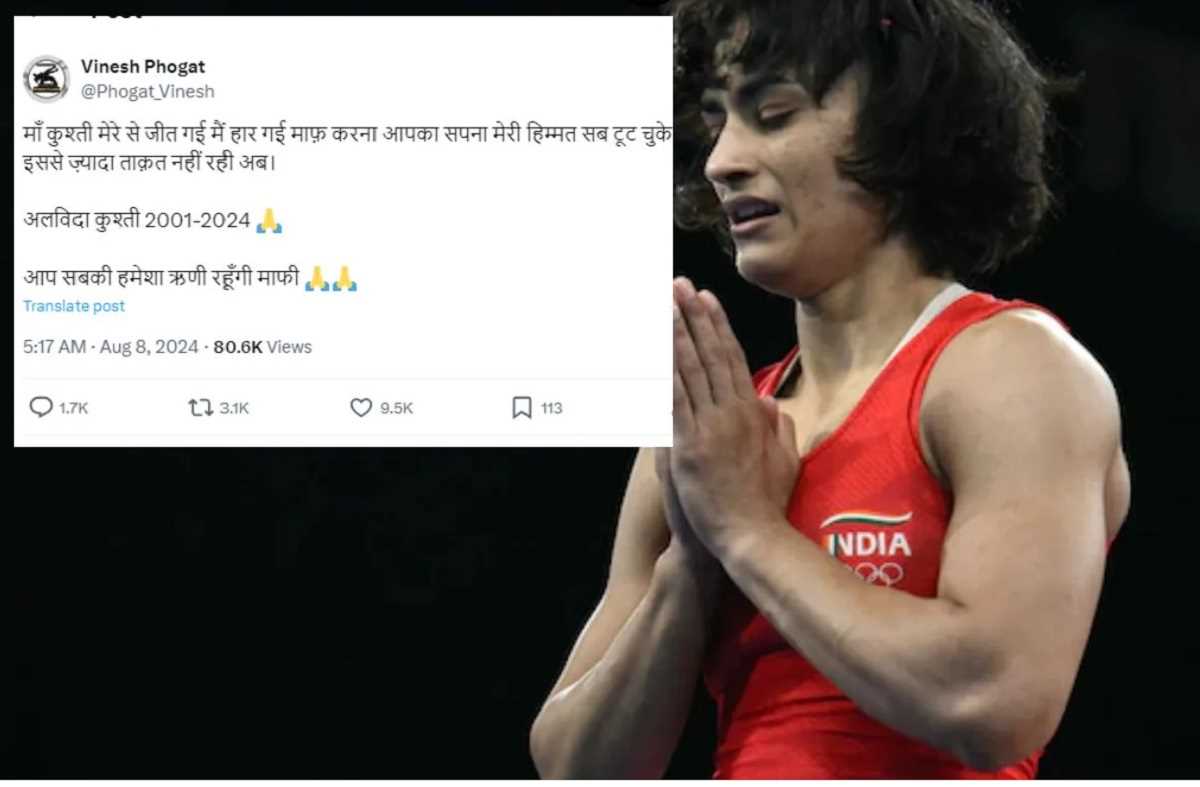खेल के मैदान में दिल टूटने के बाद, विनेश ने गुरुवार सुबह सोशल मीडिया पर एक्स पर एक भावनात्मक पोस्ट के माध्यम से कुश्ती से संन्यास लेने के अपने फैसले की घोषणा की।