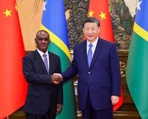 चीनी राष्ट्रपति शी जिनपिंग ने 12 जुलाई की दोपहर पेइचिंग के जन वृहत भवन में चीन की औपचारिक यात्रा पर आये सोलोमन द्वीप के प्रधानमंत्री जेरेमिया मानेले से भेंट की